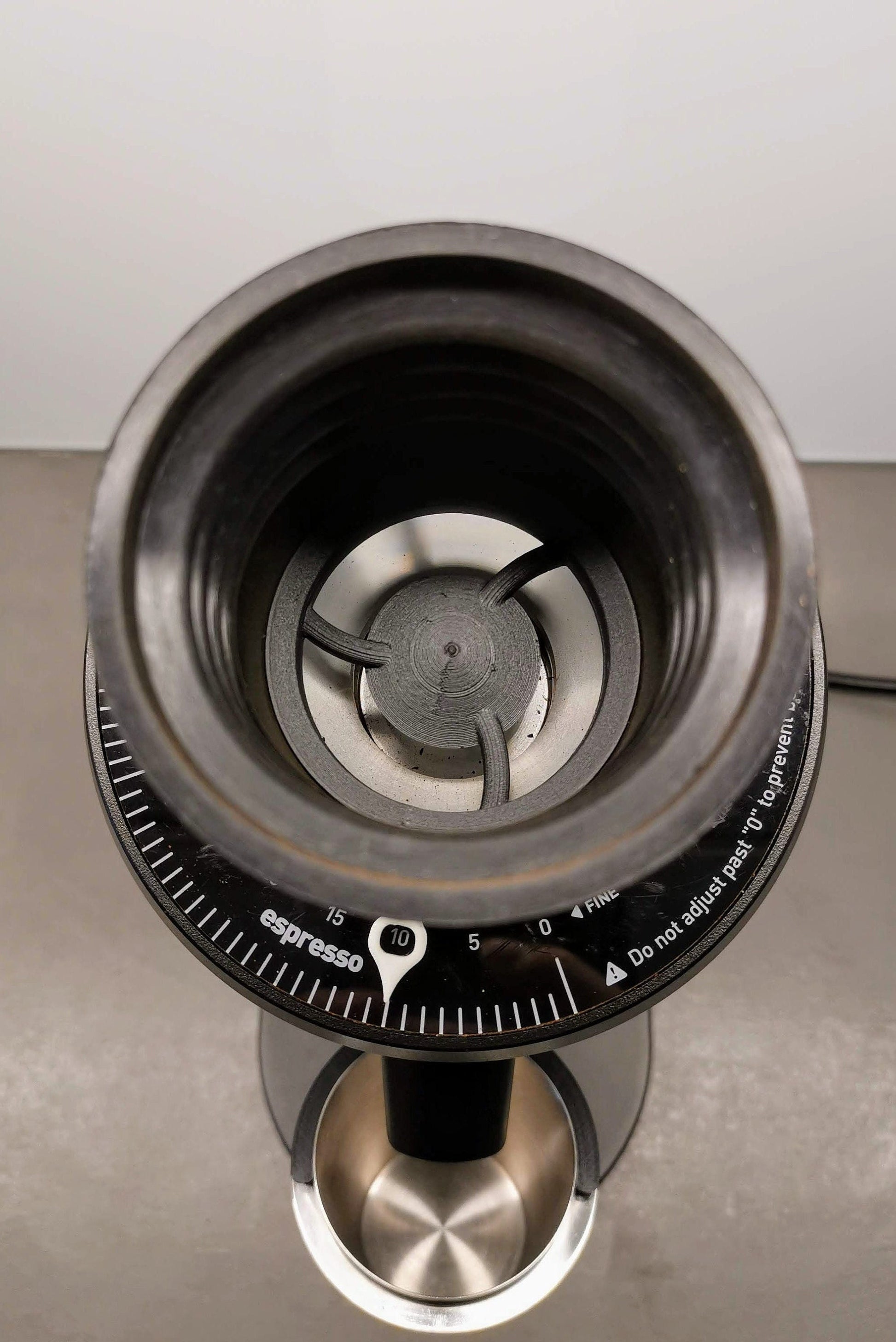 This anti popcorning device prevents coffee bean pieces to disrupt the main flow of whole beans. This way it stabilizes the grind rate and therefore improves the grind consistency.