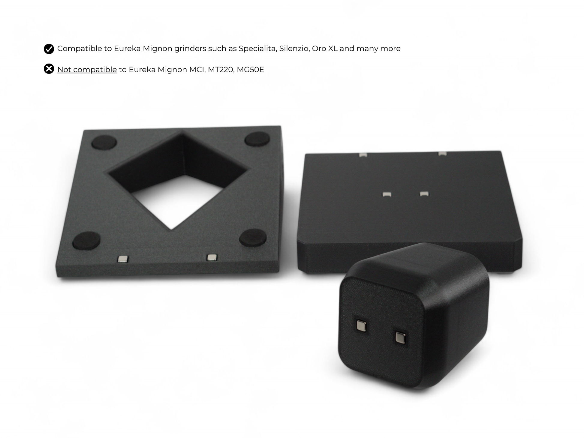 Be aware: This Low Retention Kit is NOT compatible with the Eureka Mignon MCI, MT220, MG50E, Eureka Mignon Dolce Vita, and Mignon Zero 65 All Purpose. The plastic catch cup of the Eureka Mignon Brew Pro, Filtro, and Crono is not compatible with the tilted base.