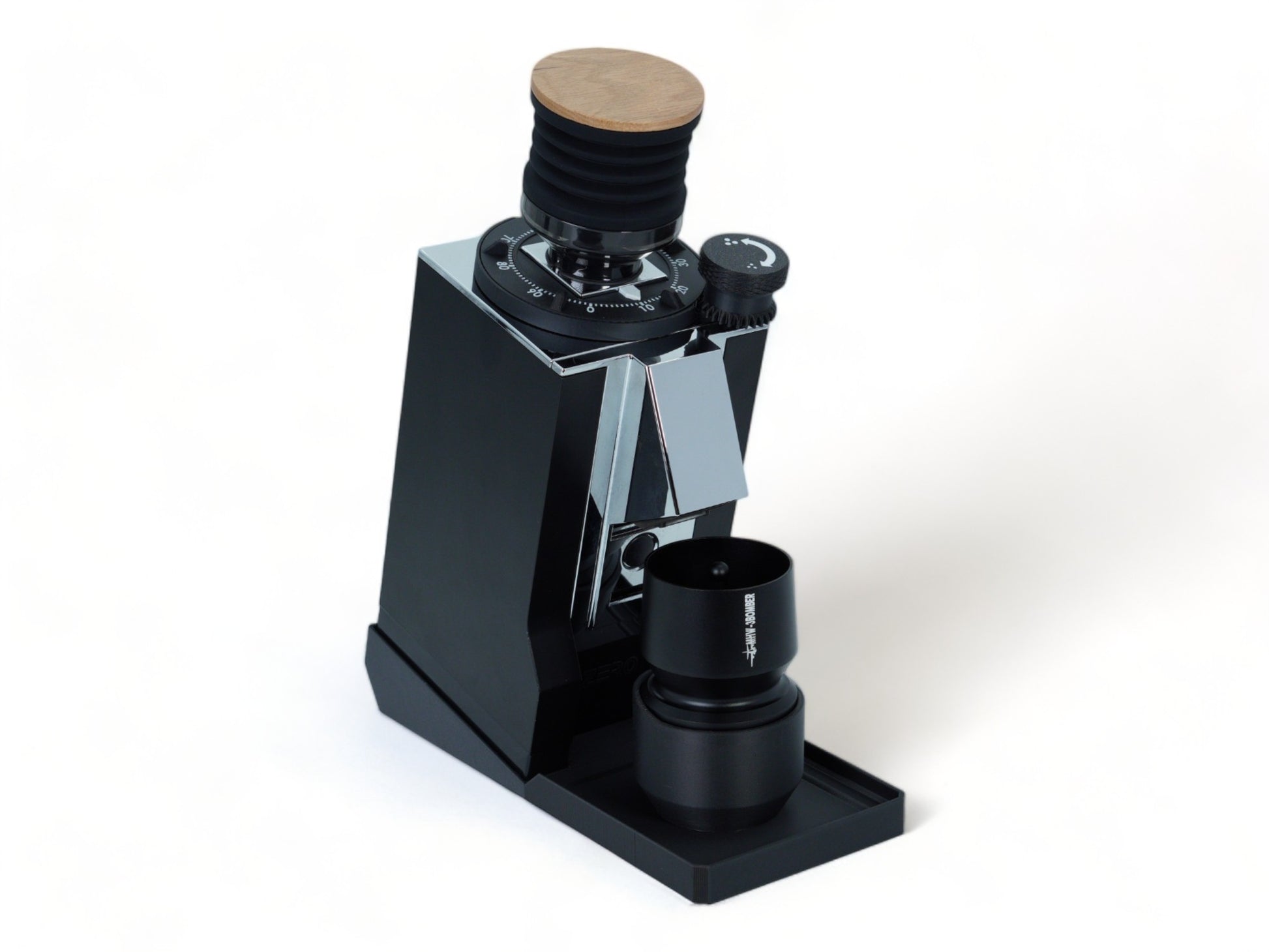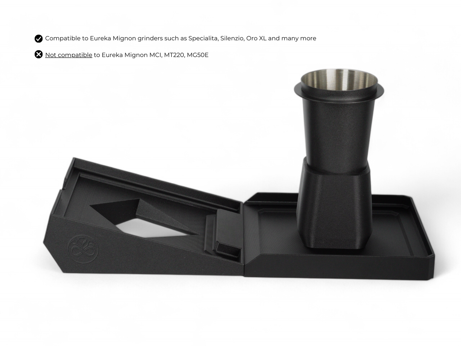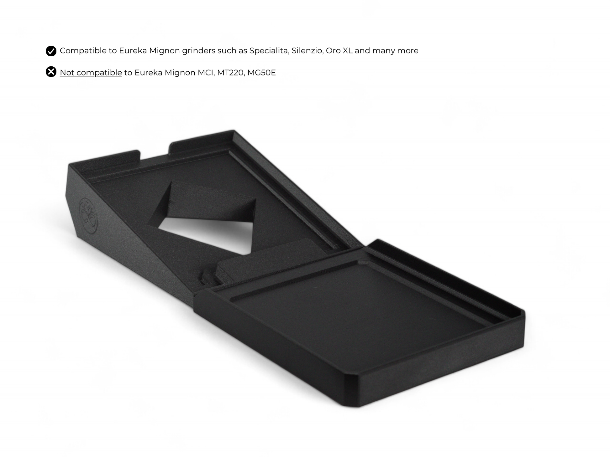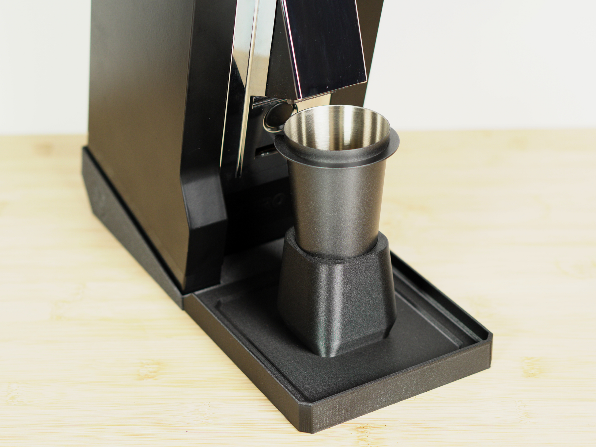 Tilted Base, magnetically attached front tray, metallic dosing cup including magnetic stand for the Eureka Mignon coffee grinder.