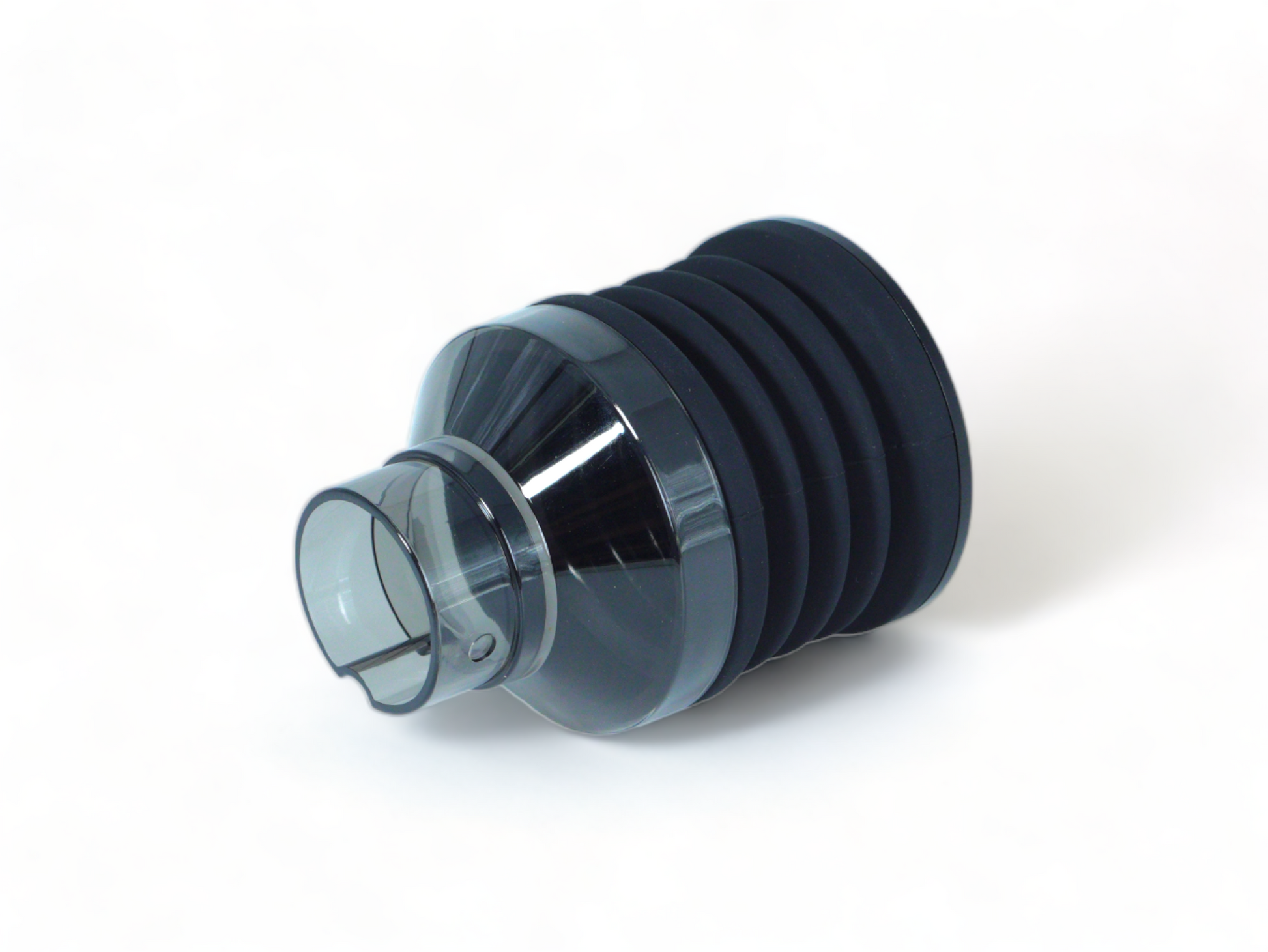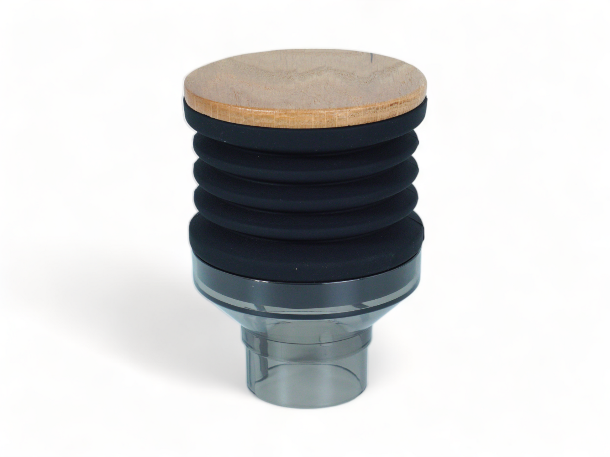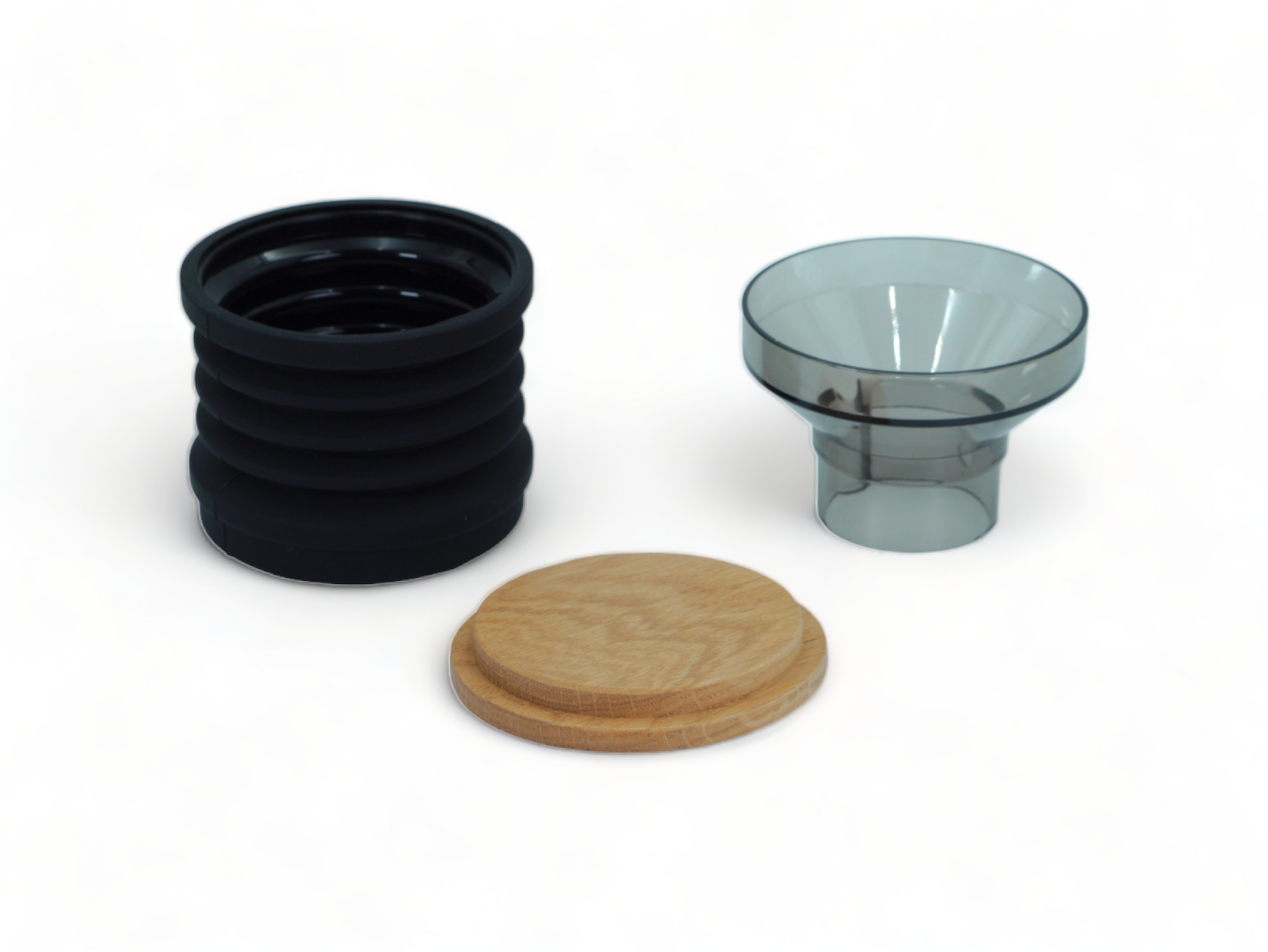 By using this set, Eureka Mignon grinders can be upgraded to a single dose grind setup. The bellow pump can be manually operated after every grind cycle to flush the grinder and chute. The transparent hopper can be operated in open or closed mode using the additional lid cover. Either aluminum or wooden lid cover material can be selected in the listing configuration.