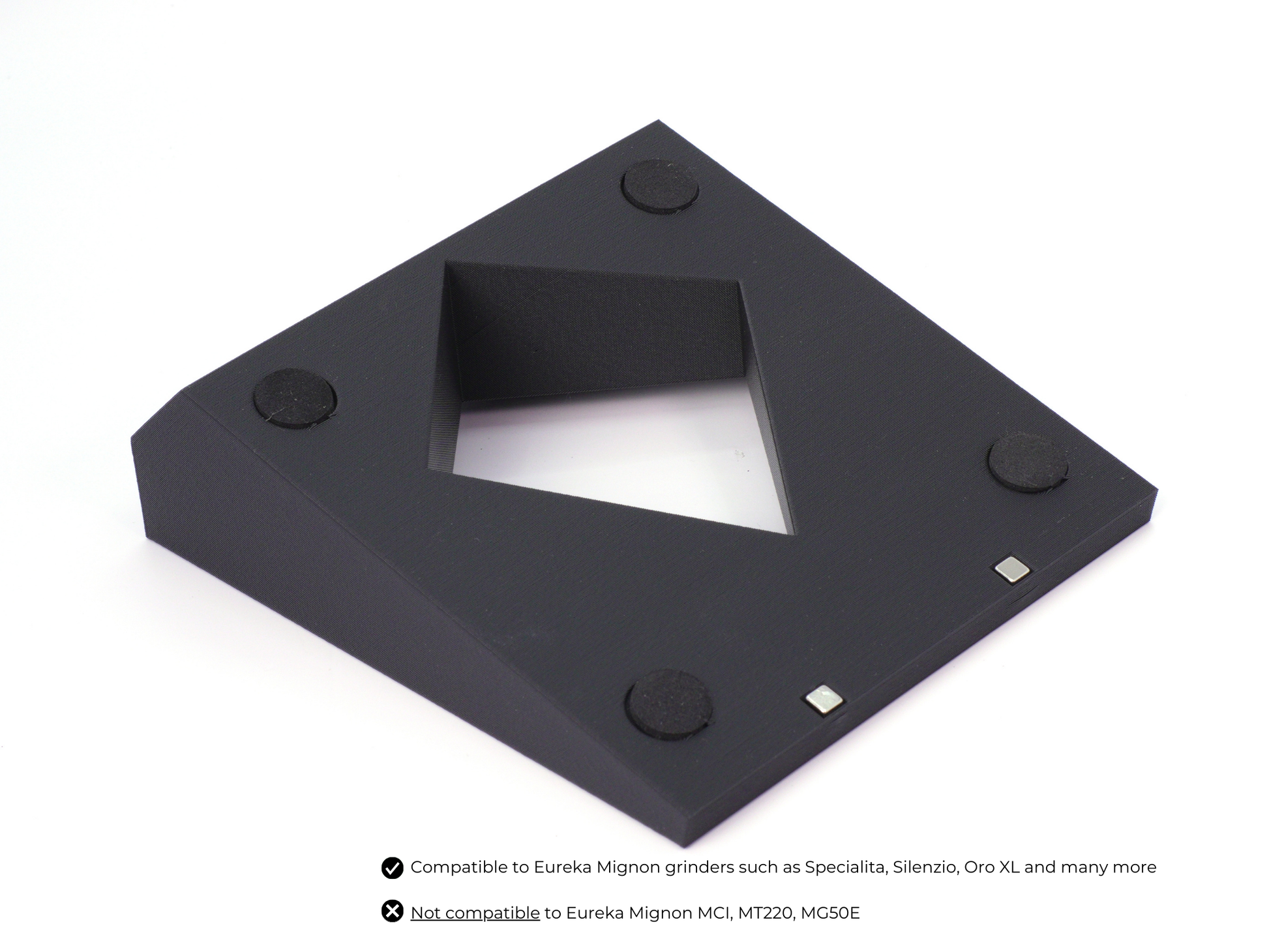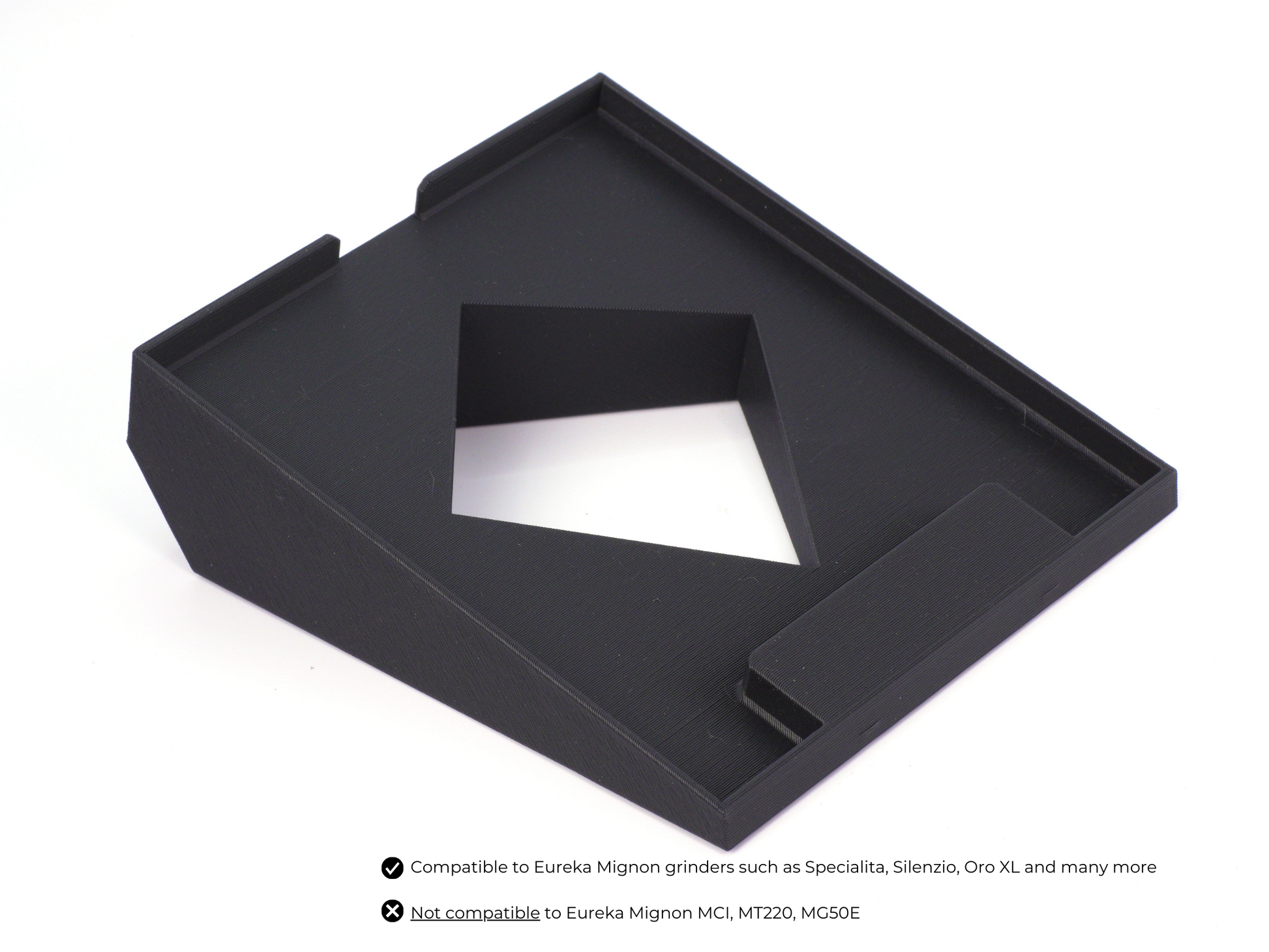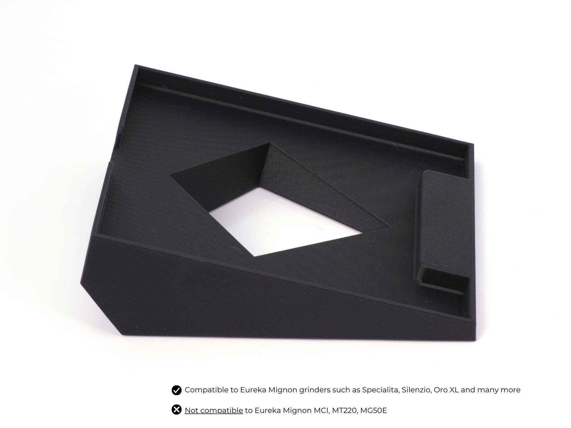 This tilted base is compatible with Eureka Mignon grinders such as Specialita, Zero, Silenzio, Filtro, Crono, Oro XL, Classico, Perfetto, Manuale, Facile, Brew Pro, and many more.