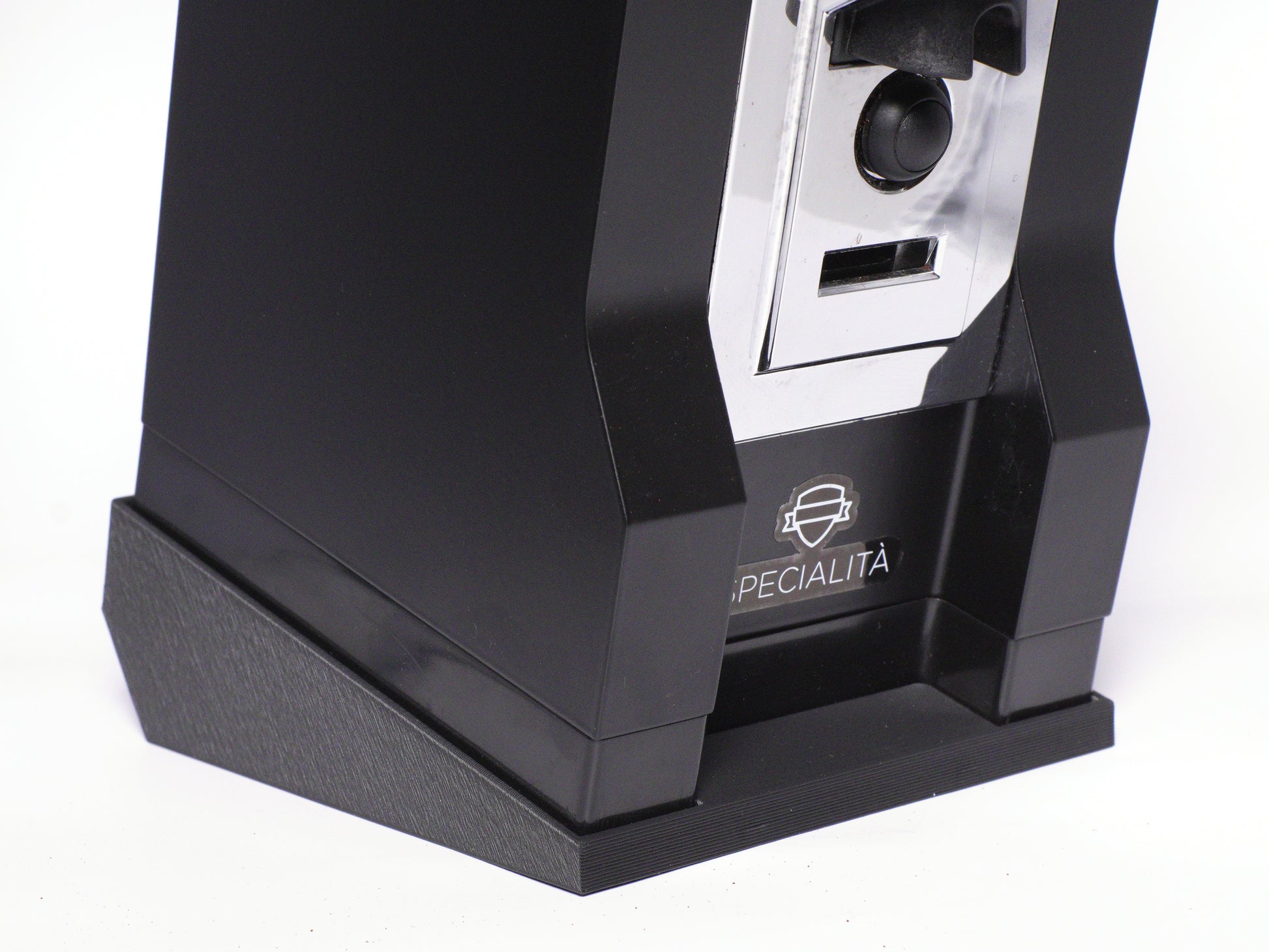 By using this tilted base, Eureka Mignon grinders can be inclined to improve the coffee grind flow from the hopper funnel through the grinder into the outlet chute. For slippery surfaces, additional anti-slip pads can be added to the inclined base.