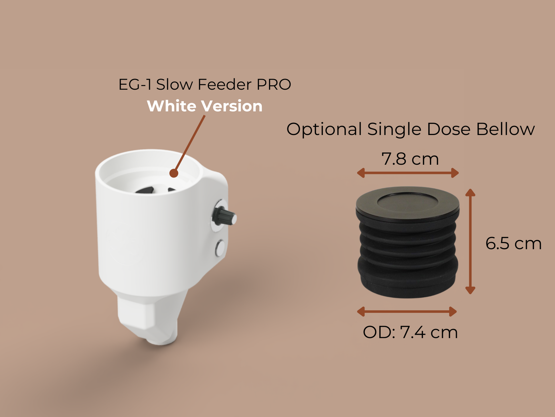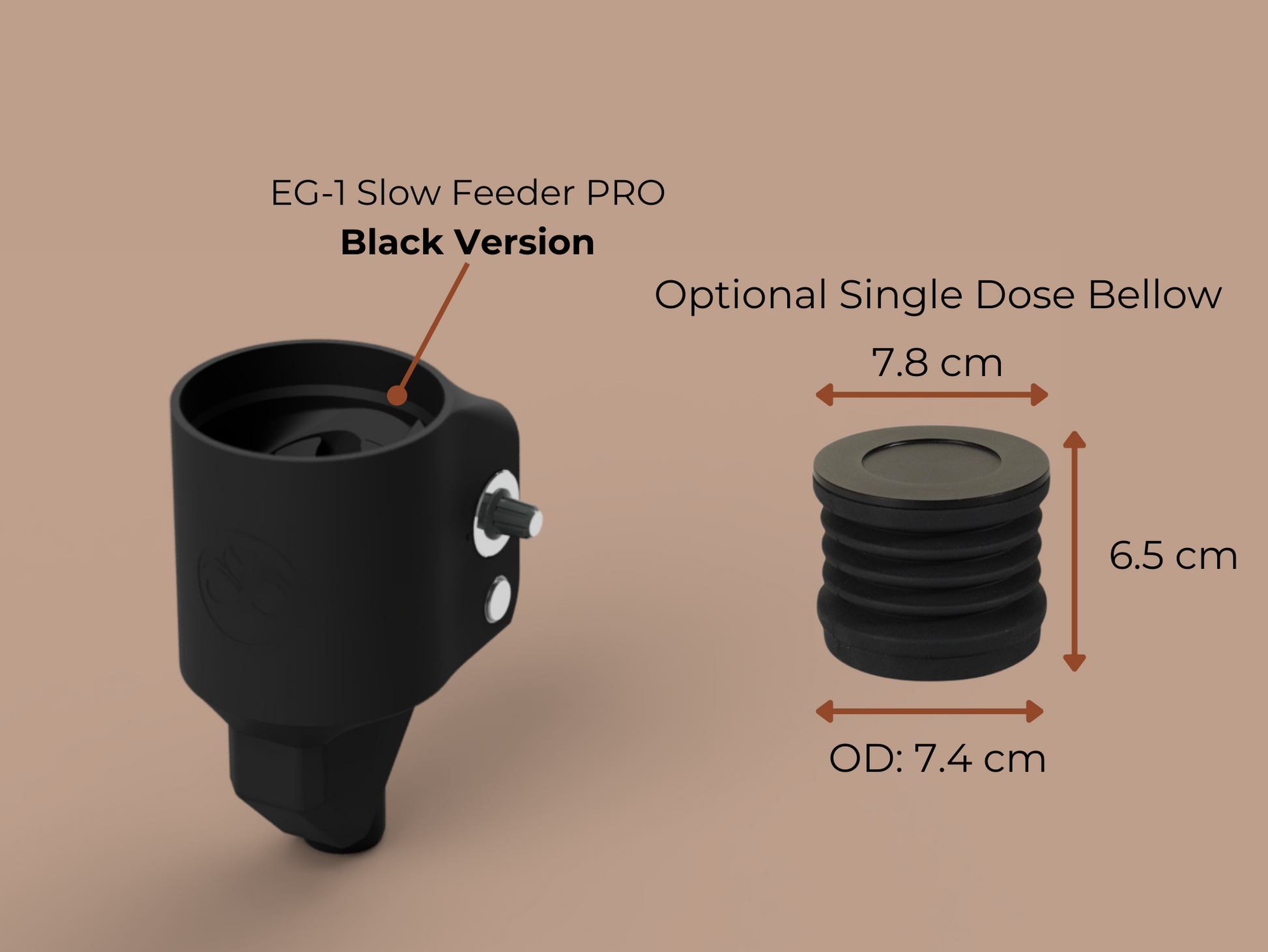 The Electric Slow Feeder is manufactured using 3D printing technology, ensuring precision, durability, and a custom fit. It seamlessly attaches directly to the grinder (excl. funnel). Optionally, a Single Dose Bellow can always be attached above the slow feeder to minimize retention.