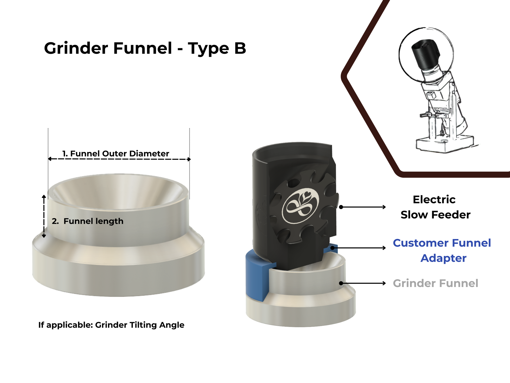 Required funnel parameters are highlighted in the product picture Grinder Funnel Type A or B. All information can be provided in the text box upon checkout, via e-mail or chat.