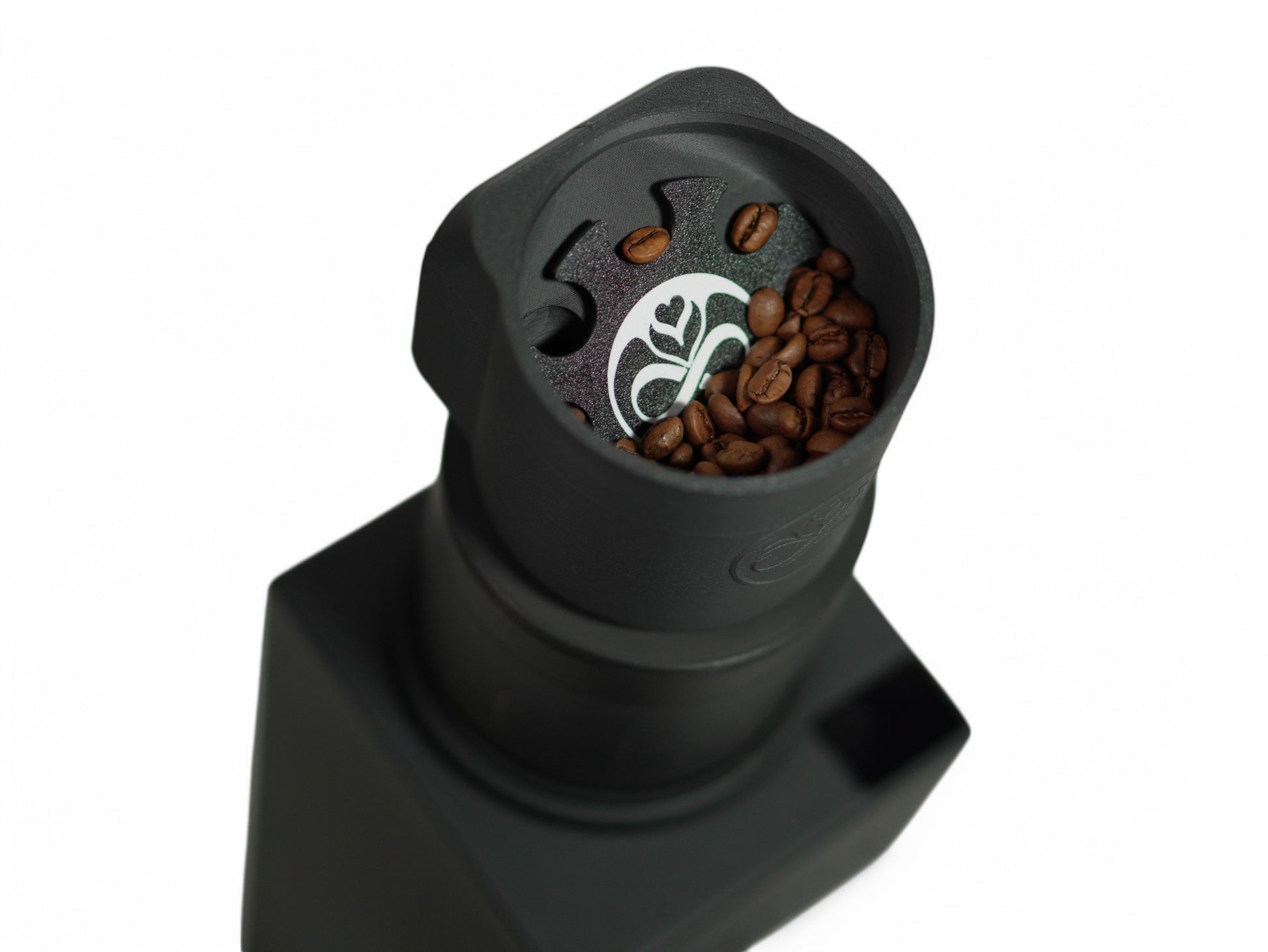 The slow feeder can hold up to 25 grams of coffee. By adding the bean volume extender, the coffee bean feed can be increased up to 50 grams.